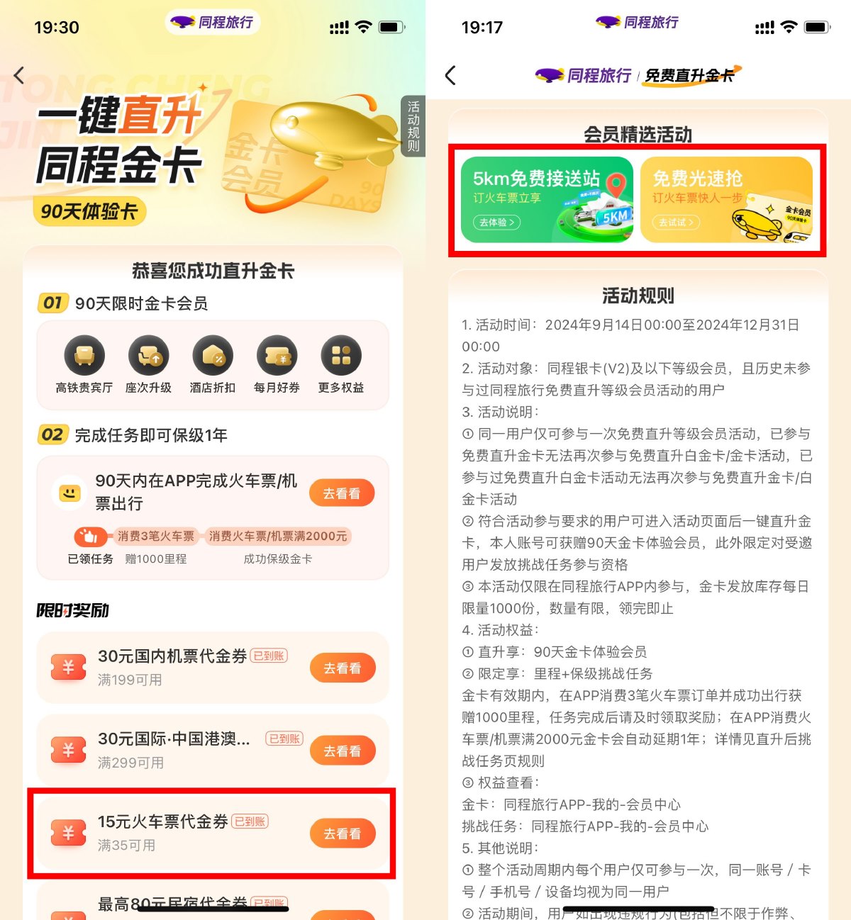 同程旅行APP搜索“抢十一”->直接领90天金卡会员,新客有火车票35-15亓券->可提前免费光速抢国庆期间火车票